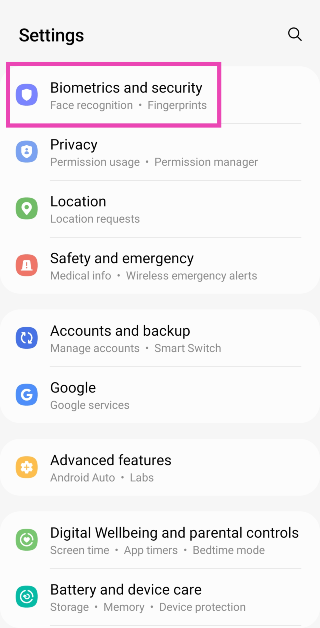 1. Adım:Gidip gelmekAyarlarve seçBiyometri ve güvenlik.