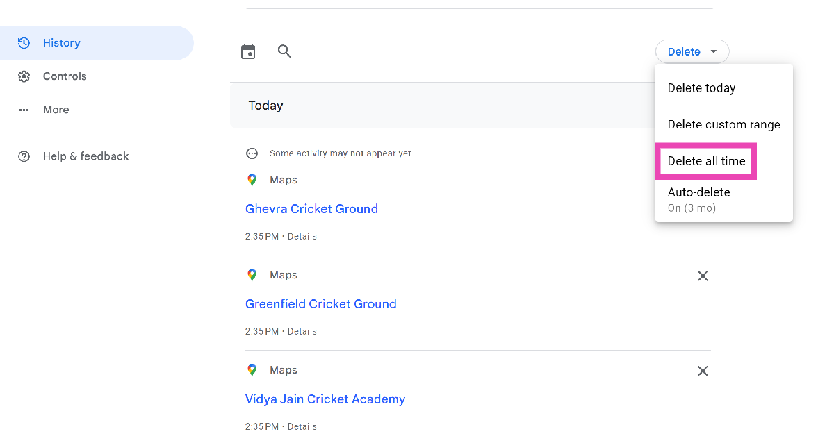 PC'nizdeki web tarayıcısını kullanarak Google Haritalar'a gidin, Hamburger menüsüne basın, 'Haritalar Etkinliği' seçin, 'Sil' yazan açılır menüye basın ve 'Tümünü Sil' seçin.