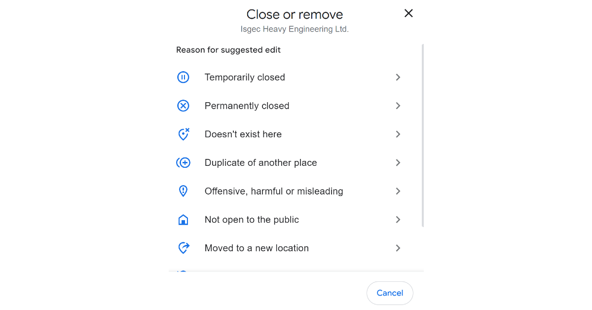 Google Haritalar, işletme adresinizi düzenlemenize veya haritadan tamamen kaldırmanıza olanak tanır. Yalnızca iş listesine sahip olan kişi bu eylemi gerçekleştirebilir. Haritada listelenen ancak artık işlevsel olmayan bir işle karşılaşırsanız, Google'a rapor edebilirsiniz. Aynı şey yanlış yerlerde listelenen işletmeler için de yapılabilir. Düzenleme yaparken Google, raporunuzu resimlerle desteklemenizi isteyecektir. Bilgiler doğrulandıktan sonra, iş yeri haritadan değiştirilecek veya kaldırılacaktır.