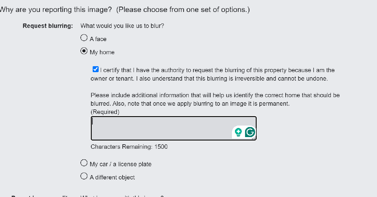 Bir yeri tamamen çıkaramazkenGoogle Street View, evinizin orada görünmesini istemiyorsanız, her zaman bulanıklaştırılması için bir istek gönderebilirsiniz. İstek gönderildikten sonra, Google sizinle iletişime geçecek ve seçtiğiniz yerde ikamet ettiğinizi doğrulayacaktır.