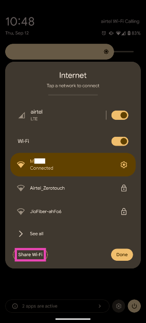 2. Adım:SeçmeWifiVe dokununAktif WiFi Ağışifresini paylaşmak için.