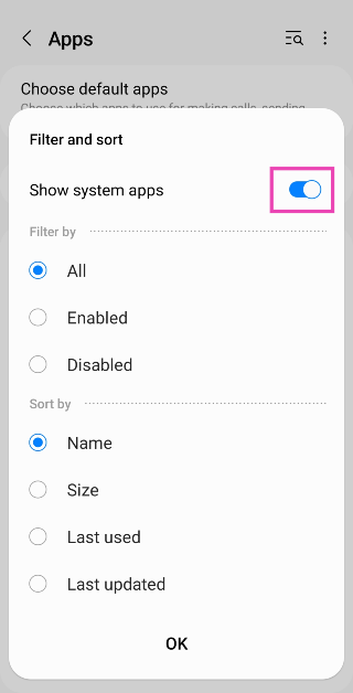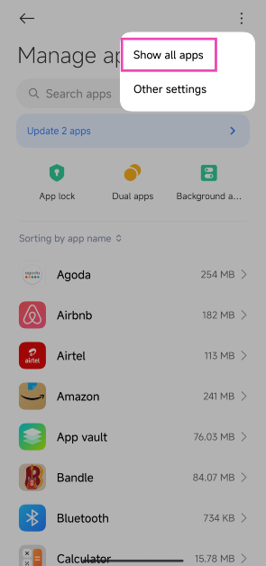 2. Adım:Seçenekler menüsüne dokunun ve seçinSistem Uygulamalarını Göster.