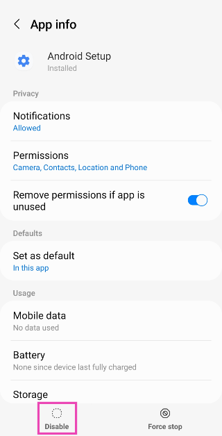 Gidip gelmekAyarlar> Uygulamalar, Android kurulumunu seçin ve bildirimini kaldırmak için uygulamayı devre dışı bırakın.