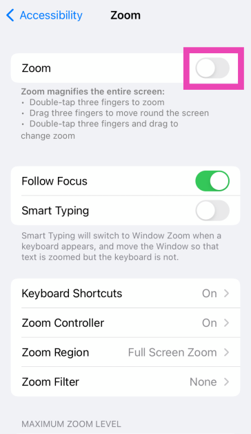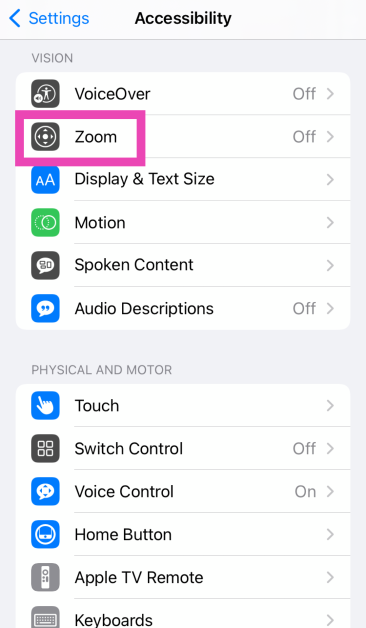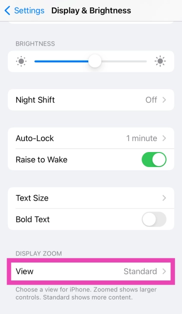 2. Adım:Aşağı kaydırın ve seçinGörüşaltındaZoom göster.