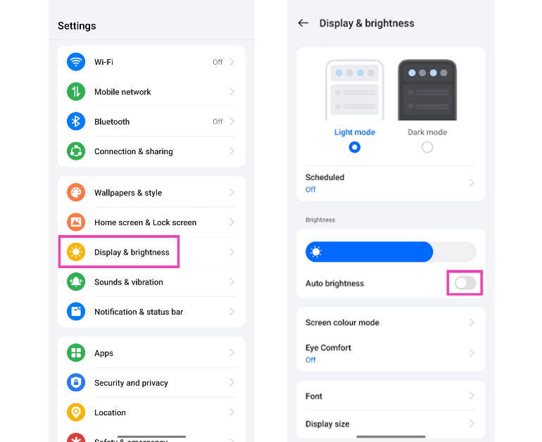 Android akıllı telefonlar, ekranın parlaklık seviyesini çevreleyen ışığa göre otomatik olarak ayarlayan kullanışlı bir 'uyarlanabilir parlaklık' özelliğine sahiptir. Doğrudan güneş ışığı altında bir dış ortamdaysanız, ekran daha okunaklı olabilmek için parlaklığını maksimum seviyeye itecektir. Benzer şekilde, geceleri, parlaklık seviyesi gözlere sert olmayacak şekilde düşer. Bazen, bu fonksiyon arızalanabilir ve çevredeki ışığın yoğunluğunu doğru bir şekilde belirleyemez. Bu durumda, telefonunuzun ekranı titremeye başlayabilir. Gidip gelmekAyarlar> Ekranve 'Otomatik Parlaklık'ın yanındaki geçiş anahtarını kapatın.