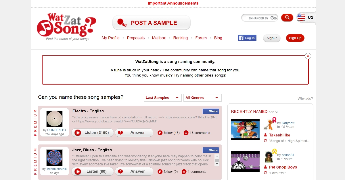 Watzatsongkafanızda sıkışmış şarkılar bulmaya adanmış 400.000'den fazla insandan oluşan bir topluluktur. Şarkının bir örneğini yayınlamak için önce kaydolmanız gerekir. Çeşitli kullanıcı grubuyla, İngilizce dışındaki dillerde şarkı aramak gerçekten kolaylaşır. Sorgunuz için doğru eşleşmeyi bulduktan sonra, etrafta dolaşabilir ve diğer kullanıcılara da istekleriyle yardımcı olabilirsiniz. Watzatsong da her şeyi müziği tartışmak için harika bir yerdir. Forumları düzgün bir şekilde farklı şarkı türlerine ayrılmıştır. Bir şarkıyı doğru bir şekilde tahmin ettikten sonra, bazı puanlar verilir. En çok maçları olan kullanıcılar web sitesinde sıralanır.