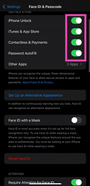 2. Adım:Emin olgeçiş anahtarıYüz kimliği açılır. Ayrıca Face ID'yi de etkinleştirebilirsiniz.Apple Hizmetlericüzdan, iTunes, otomatik dolgu ve diğerleri gibiÜçüncü taraf uygulamalar.