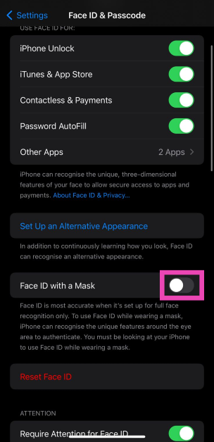 Covid-19 Pandemi sırasında Apple, yüz maskesi taksanız bile yüz kimliklerini işleyen bir ortam tanıttı. Yüzünüzün alt yarısını engelleyen maskeler veya eşarplar giyiyorsanız bu ayarı açık tutun.