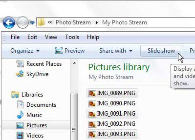 Tüm resimleriniz seçildikten sonra,Slayt gösterisiPencerenin üst kısmındaki yatay mavi çubukta düğme.