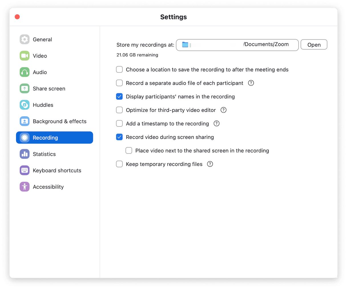 - Zoom menüsünü tıklayın ve Ayarlar> Kayıt'a gidin.