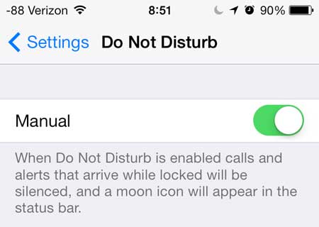 Ekranın üstünde yarım ay bir simge göreceksiniz ve etkinleştirildiğinde kaydırıcı düğmesinin etrafında yeşil gölgeleme olacak. Rahatsız etmeyin için planlanan bir dönem kullanmak istiyorsanız,PlanlanmışBunun yerine seçenek ve zaman aralığını belirtin.