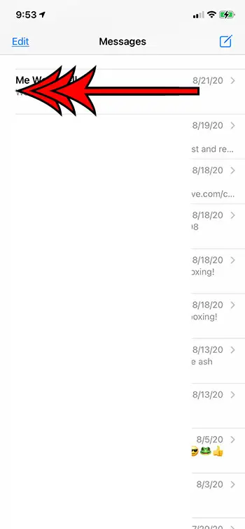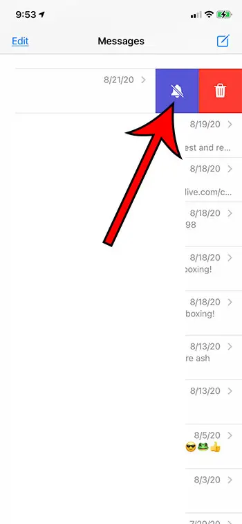 Adım 2: Bir ay veya çapraz bir çan simgesiyle veya susturmak istediğiniz bir iMessage veya kısa mesaj konuşması üzerine kaydırın.