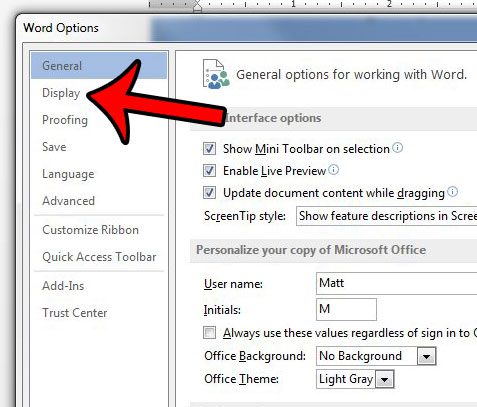 4. Adım: tıklayınGörüntülemekSekme sol tarafındaKelime Seçenekleripencere.