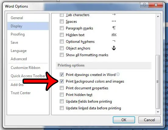 Adım 5: aşağı doğru kaydırınBaskıMenünün Seçenekler Bölümü, solundaki kutuyu işaretleyin.Arka plan renklerini ve resimlerini yazdırınsonra tıklayınTAMAMAyarlarınızı uygulamak için düğme.