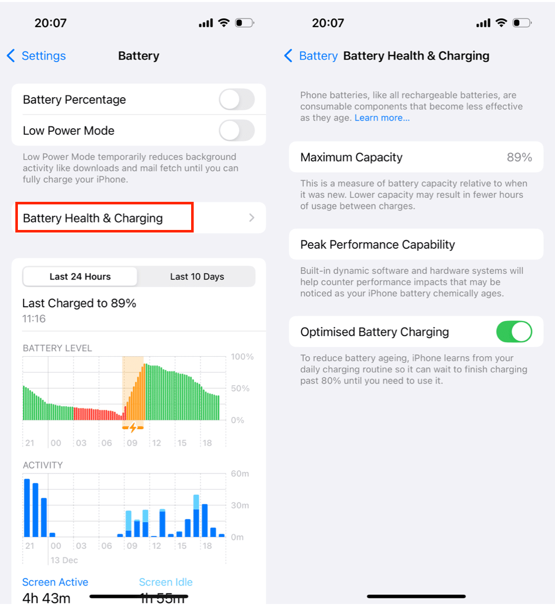 Maksimum kapasite yüzdesini bulacaksınız, bu da pilinizin yeni olduğu zamana kıyasla ne kadar şarj edebileceğini gösteriyor. Bu sayı%80'in altına düşerse, piliniz bozulmuş olarak kabul edilir ve daha kısa pil ömrü ve daha az performans fark edebilirsiniz.